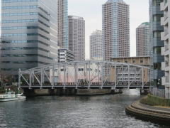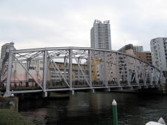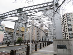 この橋は、亀島川の河口に位置し、関東大震災の復興事業の1つとして、昭和7年(1932)に架けられました。橋の主要部は、明治37年(1904)に架けられた旧両国橋の材料を利用して作られたもので、都内に現存する鉄橋のうち道路橋としては、最も古い橋です。