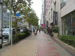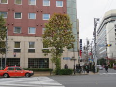 河村瑞賢屋敷跡案内板は 新川1丁目交差点南角角のホテルヴィラフォンテーヌ(新川1-8-2)前歩道(本写真左側)に設置されている
