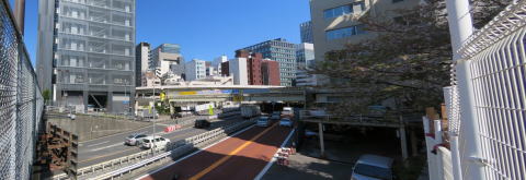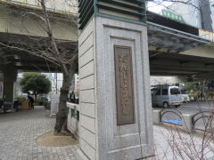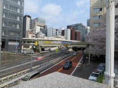 「新金橋」北詰東の親柱から 「三つ橋」があったという 首都高速の京橋JCT区域