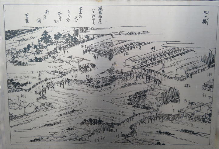 三つ橋は、すでに寛永9年(1632)作成といわれる『武州豊嶋郡江戸庄図』に図示されていますが、橋名の記入はなく、橋名についても幕末までいろいろと変遷がありました。