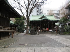 関東大震災により被害を受けた境内は昭和10年(1935)より復興、整備され、正面中央奥に社殿、左手に神楽殿と摂社八幡宮、右手に社務所と手水舎が向い合うように配置され、境内西南隅に神輿庫が設けられています。また、西北隅には富士山の溶岩で築いた富士塚があり、そこを富士信仰の場としていました。むかしの富士塚は「江戸名所図会」にも描かれた有名なものでした。