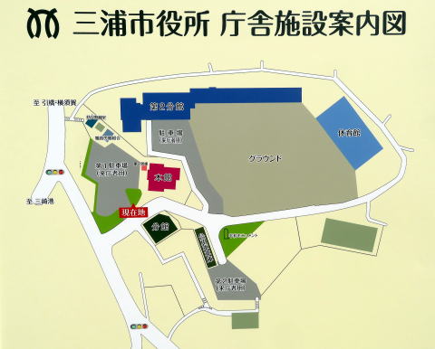 左端から 三浦市役所の本館、第2別館、グラウンド