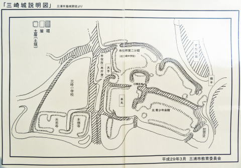 左上に「三崎城説明図」三浦半島城郭史より、右下に平成29年3月 三浦市教育委員会 と記され、縄張図と思われる図の要所要所に現在の施設名が記されている。なお、当該図は横須賀市史第8冊の赤堀直忠著「三浦半島城郭史(上)」の第16図「三崎城山説明図」を基に作成されている。