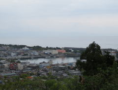 用宗漁港から持舟城趾を望む