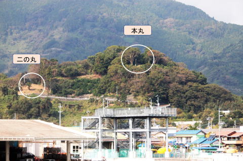 城跡は、この頂上広場(高さ76m)が本丸(本曲輪)、南西側のくぼ地に大堀切、井戸跡(曲輪)があり、その南側に二の丸(二の曲輪)、本丸の北側には腰曲輪がありました。北側の城の下は沼地と深田が広がっていました。南側は海に近く、船溜りと蔵屋敷があり、湊(港)と平山城の条件が整っていました。永い年月を経た今も、遺構はそのままの形で残っています。